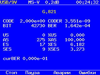 На экране Параметры G.821 представлены все параметры, которые измеряются по рекомендации G.821. Недоступные секунды отсчитываются от начала 10 последовательных секунд, несколько раз пораженных ошибками, и заканчиваются в начале 10 секунд, непораженных ошибками. Вид меню Параметры G.821представлен на рисунке 3.
