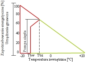 Бівалентна – альтернативна система опалення – це система, в якій працюють два обігріваючі пристрої, співпрацюючи між собою в різних конфігураціях (рис. 2.5). Тепловий насос покриває енергетичні потреби до визначеної зовнішньої температури (Tbw – температура бівалентної точки, вимикання теплового насосу), наприклад – 8°C. За цієї температури припиняється робота теплового насосу, обігрівання здійснюється іншим пристроєм (електричним або газовим котлом, комином з водяним контуром або ін.). В якості опалювальних приладів використовують як низькотемпературні системи радіаторів і системи «тепла підлога», «теплі стіни» (води, ґрунту, повітря) так і високотемпературні радіатори з температурою живлення до + 90 °С. Бівалентна система – паралельна моноенергетична. У такій системі опалення працюють два обігріваючі пристрої (рис.2.6.). Тепловий насос покриває енергетичні потреби до визначеної зовнішньої температури (Tbz – температура бівалентної точки, перемикання на інший пристрій), наприклад -8°C. За цієї температури в роботу вступає другий обігріваючий пристрій. З цього моменту обидва пристрої працюють паралельно. У випадку, якщо другим обігрівачем є електричний нагрівач, це є бівалентна паралельна моноенергетична система. Джерелом низькопотенційного тепла може бути: ґрунт, вода.