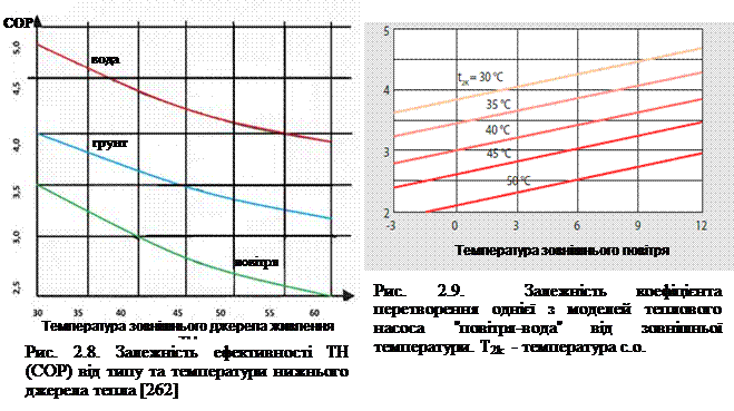 Бівалентна система – частково-паралельна. Робоча система застосовується за температури живлення до 65°C і більше (рис.2.7). Ця система працює аналогічно попередній, і за температури, наприклад -8°C, в роботу вступає другий обігріваючий пристрій: газовий або дизельний котел, електричний нагрівач. З цього моменту обидва пристрої працюють паралельно. Але при подальшому зниженні зовнішньої температури тепловий насос вимикається (температура бівалентної точки, вимикання теплового насосу) і все навантаження переймає другий обігрівальний пристрій, наприклад, котел, нагрівач, турбокомин. Джере Вибираючи систему тепло забезпечення необхідно враховувати, що ефективність роботи теплового насосу в значній мірі залежить від температури зовнішнього джерела тепла. При зменшенні температури цього джерела до - 5 – 8 °С коефіцієнт потужності теплового насоса зменшується до 1 і його використання стає неефективним. Тому повітряні теплові насоси на більшості територій України використовувати без додаткового джерела живлення не рекомендується. Теплові насоси, що використовують ґрунтові води або вертикальні ґрунтові колектори потребують більших початкових капіталовкладень на облаштування свердловин або паль та ґрунтові роботи. Але в подальшому зменшуються експлуатаційні витрати на систему опалення і в такому випадку можна обійтись моновалентною системою опалення.