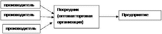 Рис.1 - Прямая поставка (транзитная) Эта форма применяется при оптовых закупках большими партиями со склада изготовителя. Существует граница её применения, которая определяется минимальным объёмом партии поставки, ниже которой поставка становится экономически невыгодной для предприятия-изготовителя (если величина потребления сырья, материалов в месяц или квартал равна или больше транзитной нормы, возможно использование транзитной формы снабжения). При складской форме снабжения материальные ресурсы закупаются у фирм-посредников. Эта форма поставок позволяет предприятию закупать материальные ресурсы небольшими партиями и в широком ассортименте у одного поставщика-посредника (оптовой торговой организации) (Рис 2.) Эта форма поставок позволяет не создавать излишки материалов на складах, что способствует улучшению использования материальных ресурсов и снижению издержек предприятия. Появление посредников в цепи поставок ведёт к увеличению цены закупаемых материальных ресурсов, но позволяет экономить на складских издержках. Данная форма снабжения характерна для малых предприятий.