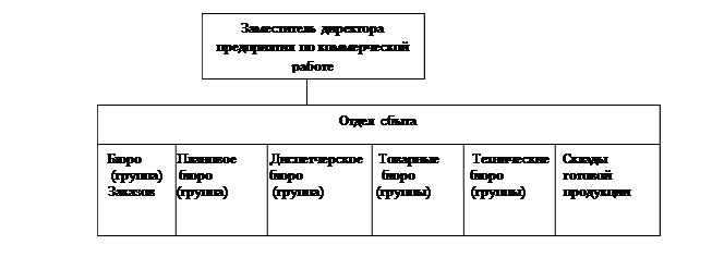 Товарный тип оргструктуры предусматривает специализацию отдельных подразделений службы по сбыту определённых товарных групп или отдельных товаров. Этот тип оргструктуры используется при сбыте товаров широкого ассортимента на относительно небольшом числе однородных рынков. Такая организация сбыта целесообразна в первую очередь для очень крупных предприятий, которые имеют большой товарооборот по каждой группе товаров и каждому виду товаров. Организационная структура отдела сбыта производственного предприятия товарного типа