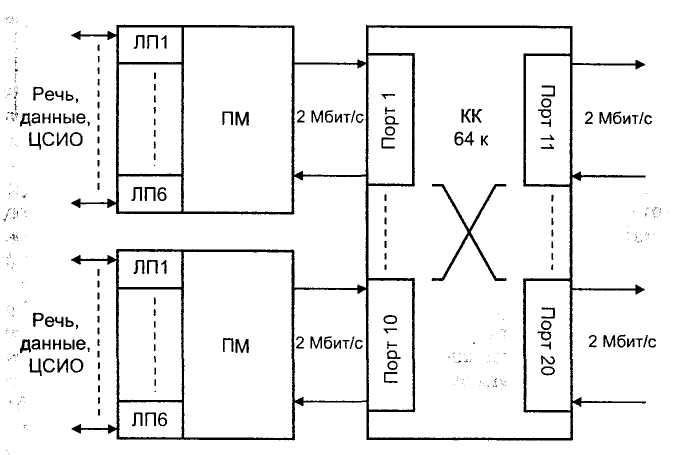Рис 1. Универсальная система первичного мультиплексирования кроссконнекторы основных цифровых каналов (КК ОЦК) и первичные мультиплексоры (ПМ), которые называют также «гибкими» мультиплексорами, чтобы подчеркнуть их универсальность. На рис 1 показаны названные элементы системы; комбинация первичных мультиплексоров и кроссконнектора представляет собой универсальный сетевой узел. Сигналы от абонентов поступают на линейные платы ЛП первичных мультиплексоров ПМ, преобразуются в сигналы основных цифровых каналов ОЦК (64 кбит/с) и объединяются в стандартные первичные цифровые потоки (2 Мбит/с). Первичные цифровые потоки поступают на кроссконнектор КК ОЦК, который может осуществлять коммутацию, как первичных потоков, так и их составляющих - основных цифровых каналов (ОЦК). Соединения в кроссконнекторе устанавливаются как между портами первичных потоков, так и временными интервалами внутри первичного потока. Кроме того, кроссконнектор обычно может обеспечивать конференц-связь и многоточечное соединение абонентов. Кроссконнектор поддерживает различные способы передачи сигналов взаимодействия и управления. Структурная схема КК ОЦК представлена на рис 2. В его состав входят: центральный блок, платы портов 2 Мбит/с (ПП), блок