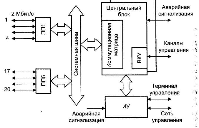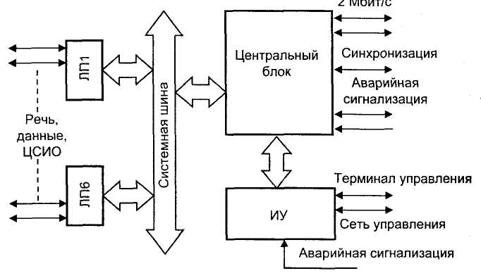 интерфейсов управления и системная шина. Основное назначение центрального блока: коммутация сигналов, подготовленных портами 2 Мбит/с, и переданных на коммутационную матрицу блока по системной шине. Кроме этого, центральный блок имеет в своем составе генераторное оборудование, обеспечивающее необходимыми сигналами все системы кроссконнектора. Генераторное оборудование может быть синхронизировано от внутреннего генератора, от внешнего источника и от сигнала, выделенного из потока 2 Мбит/с. Синхросигнал от генераторного оборудования выводится на внешний выход. Кроме интерфейса синхросигнала центральный блок имеет обычно внешние интерфейсы для передачи сервисной информации. Во-первых, это интерфейс встроенного канала управления (ВКУ), для которого занимается один из информационных ОЦК. Во-вторых, это интерфейсы каналов, организуемых на тех позициях циклов первичных потоков, которые предназначены для передачи извещения о срочной и отложенной авариях. В третьих, это интерфейсы каналов, образуемых на позициях цикла, зарезервированных для нужд национальной сети. Обычно в состав центрального блока входит также блок питания КК ОЦК. Как правило, с целью повышения надежности центральный блок дублируется (100% «горячий» резерв). Помимо системной шины в состав кроссконнектора входит также шина контроля, через которую центральный блок связан с блоком поддержки интерфейсов управления (ИУ). Блок ИУ обеспечивает связь кроссконнектора с внешней сетью управления телекоммуникациями TMN. К блоку ИУ подключается также терминал оператора. Процессор, который установлен в центральном блоке, контролирует работу всех блоков кроссконнектора, выводит аварийные сигналы и регистрирует параметры качества принимаемых сигналов. Каждая плата портов ПП может содержать несколько портов трактов 2 Мбит/с. Каждый порт обеспечивает все основные функции, обеспечивающие параметры стандартного интерфейса (точки стыка) первичного цифрового тракта. К этим функциям относятся: преобразование кода сигнала из натурального в линейный и обратно; - выделение тактовых сигналов из линейного; - цикловая и сверхцикловая (при необходимости) синхрониза - контроль появления ошибок методом CRC-4. Структурная схема первичного мультиплексора ПМ представлена на рис 3. Основными узлами ПМ являются: центральный блок, линейные платы (ЛП), системная шина и шина управления и блок поддержки управляющих интерфейсов (ИУ).