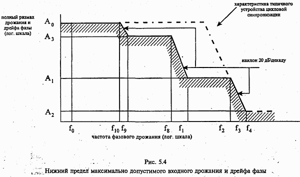 г) увеличить отношение сигнал/шум на определенную величину; ц) установить частоту входного фазового дрожания на нужное значение; е) регулировать амплитуду фазового дрожания до получения первоначального значения К0, зарегистрированного в в); д) зарегистрировать амплитуду и частоту поданного входного фазового дрожания и повторить операции г) — д) с числом частот, достаточным для определения характеристики допустимого фазового дрожания. 6.3.1.3. Метод с использованием критерия появления ошибок Критерий появления ошибок для измерения допустимого значения фазового дрожания определяется как наибольшая амплитуда фазового дрожания на заданной частоте, дающая в конечном счете не более двух секунд с ошибками, суммируемых в последовательных 30-секундных измерительных интервалах, в течение которых амплитуда фазового дрожания возрастала. Рассматриваемый метод заключается в регулировке частоты фазового дрожания и в определении амплитуды фазового дрожания испытательного сигнала, обеспечивающего соблюдение критерия появления ошибок. Данный метод включает в себя следующие операции: