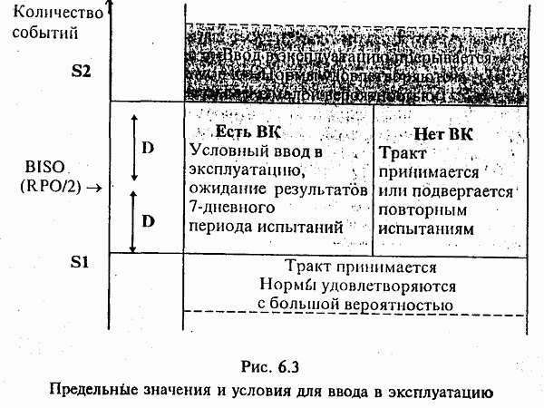 Шаг 2: После удачно выполненного первого шага проводятся измерения в течение 24-часового (или другого, соответствующего данному типу тракта) периода времени. Эти измерения в сетевых трактах могут проводиться без прекращения связи, если в аппаратуре образования тракта имеется встроенный контроль, обеспечивающий оценку показателей ошибок. Если такого контроля нет, измерение проводится с использованием измерительного прибора. Если в любое время в течение этих испытаний произойдет случай неготовности, фиксируемый измерительным прибором или средствами встроенного контроля, должна быть найдена причина и проведены новые испытания. Если новый случай неготовности будет иметь место во время повторных испытаний, испытания должны быть приостановлены до устранения причины появления случая неготовности. Примечание. Если имеющиеся технические средства (измерения и контроля) не позволяют регистрировать случаи неготовности, допускается, чтобы эти требования по случаям неготовности не учитывались. После окончания необходимого периода времени результаты измерений сравниваются с порогами S1 и S2 норм на каждый параметр для данного канала или тракта и данной длительности измерения. При этом возможны следующие случаи: если значения и ES, и SES меньше или равны соответствующим значениям S., тракт (канал) принимается и вводится нормальный режим работы; если значения ES или SES (или оба) больше или равно соответствующим значениям S2, тракт (канал) бракуется и вводится режим локализации неисправности в соответствии с процедурами, данными в подразделе 6.2.3; если значения или ES, или SES (или оба) больше соответствующих значений S1, но оба меньше соответствующих значений S2, тракт (канал) может быть или принят условно или подвергнут повторным испытаниям той же длительности, если не имеется встроенного контроля, а если он имеется, то тракт принимается условно и испытания продолжаются до 7 суток с учетом первого периода испытаний. По окончании повторных испытаний результаты сравниваются с нормами для данного.тракта (канала), т.е. со значениями BISO для 7 суток. Процедура сравнения с нормами по окончании шага 2 проиллюстрирована на рис. 6.3. Примечание. Если проводятся измерения по шлейфу (схема рис. 6.26), должны рассматриваться значения S1 и S2 для одного направления передачи. При этих условиях невозможно оценивать ухудшение раздельно по направлениям. Если измерения дают отрицательный результат, они проводятся снова отдельно по направлениям. 6.2.2.5. Порядок и длительность испытаний При вводе в эксплуатацию одного цифрового тракта (как правило, высшего порядка, соответствующего порядку линейного тракта вводимой в эксплуатацию цифровой системы передачи) испытания должны проводиться согласно процедуре, описанной в разделе 6.2.2.4, причем длительность измерений шага 2 должна составлять 24 часа. При вводе в эксплуатацию более одного цифрового тракта в одно и то же время процедура, которая должна быть использована, зависит от того, был ли тракт более высокого порядка, в котором образованы подлежащие испытаниям тракты, в эксплуатации некоторое время или он также новый. Процедуры для трактов первого порядка зависят также от того, имеется или нет встроенный контроль без прекращения связи (ВК).