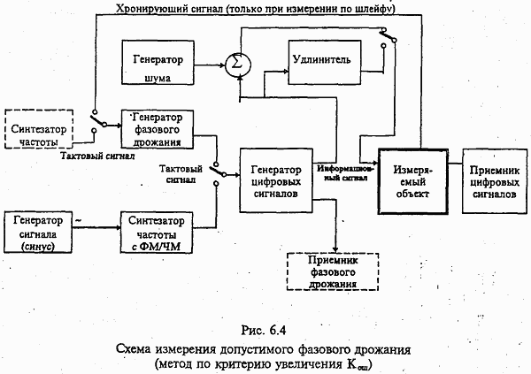 6. МЕТОДИКА ИЗМЕРЕНИЙ ЭЛЕКТРИЧЕСКИХ ПАРАМЕТРОВ ЦИФРОВЫХ КАНАЛОВ И ТРАКТОВ 6.1. Общие положения 6.1.1. Приведенные в настоящем разделе методы измерений распространяются на основной цифровой канал (ОЦК), первичные, вторичные, третичные и четверичные цифровые сетевые тракты. 6.1.2. Методы измерения приводятся для двух нормируемых параметров: показателей ошибок и фазового дрожания в разделах 6.2 и 6.3 соответственно. 6.1.3. Измерения цифровых каналов и трактов на соответствие нормам проводятся по-разному в зависимости от выполняемой функции техобслуживания и могут быть подразделены на следующие виды: измерения на соответствие долговременным нормам; измерения при вводе трактов в эксплуатацию; измерения при техническом обслуживании. 6.1.4. Измерения на соответствие долговременным нормам проводятся при приемке каналов и трактов, образованных в новых системах передачи, ранее не применявшихся на сети ВСС России, обычно такие измерения проводятся одновременно с сертификационными испытаниями оборудования, а также при эксплуатационных исследованиях, организуемых в рамках работ по повышению эксплуатационной надежности сети. Эти измерения выполняются по отдельному графику работ силами эксплуатационного персонала, производственных лабораторий с привлечением специалистов НИИ. Измерения этого вида являются наиболее длительными и полными. Соответствие нормам по показателям ошибок должно оцениваться не менее 1 месяца, методика измерений приведена в п. 6.2.1. При этом виде измерений, как правило, проверяются все нормируемые характеристики фазового дрожания с целью выработки рекомендаций по улучшению работы трактов. 6.1.5. Методы измерений при вводе в эксплуатацию проводятся как для случаев сдачи в эксплуатацию цифровых сетевых трактов и каналов передачи в новых системах передачи, так и ввода в эксплуатацию новых трактов и каналов, организуемых на существующих вышестоящих (линейных и сетевых) трактах. 6.1.6. Измерения при вводе в эксплуатацию проводятся, как правило, только по показателям ошибок в течение более коротких периодов времени. Порядок и рекомендации по их проведению приведены в п. 6.2.2. При вводе в эксплуатацию цифровых каналов и сетевых трактов обычно достаточным является измерение показателей ошибок. Но с целью накопления статистических данных по первичной сети в 1-й год с момента введения норм проверка на соответствие нормам на дрожание и дрейф фазы является обязательной для указанного вида испытаний. В некоторых случаях при вводе трактов в эксплуатацию может потребоваться при невыполнении норм на коэффициент ошибок проведение исследований фазового дрожания. Цель измерений состоит в том, чтобы убедиться в правильной работе цифрового канала или сетевого тракта с точки зрения передачи информации и выполнения действий по техобслуживанию. При этом предполагается, что участки транзита цифрового тракта (простые цифровые тракты) уже подвергнуты проверке на работоспособность в процессе настройки. 6.1.7 Измерения при вводе в эксплуатацию должны включать не только периоды непосредственно измерений показателей ошибок, описанные ниже, но и периоды работы аппаратуры на линии, когда по встроенному контролю можно убедиться, что нет никаких нарушений, связанных с промышленной деятельностью (под промышленной деятельностью понимается 