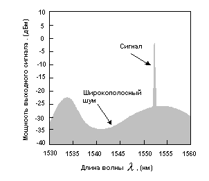 Лазер накачки возбуждает электронную подсистему примесных атомов, в результате чего электроны с основного состояния (уровень А) переходят в возбуждённое состояние (уровень В). Далее происходит релаксация электронов с уровня В на промежуточный уровень С. Когда заселённость уровня С становится достаточно высокой, так что образуется инверсная заселённость уровней А и С, то такая система способна индуцировано усиливать входной оптический сигнал в определённом диапазоне длин волн. При отсутствии входного сигнала происходит спонтанное излучение возбуждённых атомов примесей, приводящее к шуму. Режимы работы усилителя во многом зависят от типа примесей и от диапазона длин волн, в пределах которого он должен усиливать сигнал. Наиболее широко распространены усилители, в которых используется кремниевое волокно, легированное эрбием. Такие усилители получили название EDFA. Межатомное взаимодействие является причиной очень важного положительного фактора - уширения уровней, что, в конечном итоге, обеспечивает усилителю широкую зону усиления сигнала. В EDFA наиболее широкая зона усиления от 1530 до 1560 нм, соответствующая переходу Усиление в другом окне прозрачности 1300 нм можно реализовать с использованием примесей празеодимия, однако такие оптические усилители не получили большого распространения. Коэффициент усиления сигнала зависит от его входной амплитуды и длины волны. При малых входных сигналах амплитуда выходного сигнала растёт линейно с ростом входного сигнала, коэффициент усиления достигает при этом своего максимального значения. Однако при некотором достаточно большом входном сигнале сигнал на выходе достигает своего насыщения, что приводит к падению коэффициента усиления при дальнейшем увеличении уровня входного сигнала рис.15.