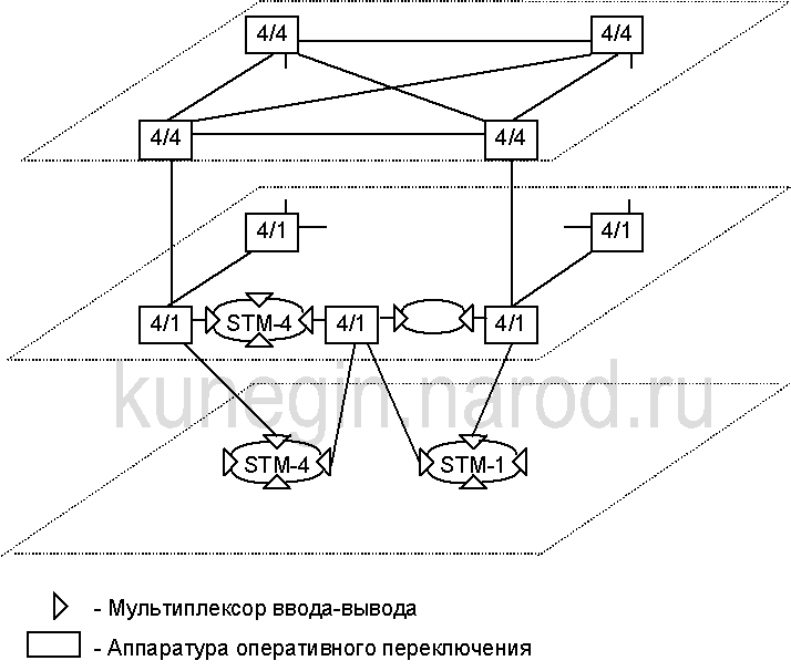 . Трехуровневая архитектура сети СЦИ Верхний (базовый, магистральный) уровень образуется главными узлами, в которых устанавливается АОП 4/4. Основными единицами, которыми обмениваются эти узлы, служат виртуальные контейнеры VC-4. Каждая линия несет по несколько STM-4 или STM-16. Структура сети на этом уровне решетчатая. Средний уровень состоит из нескольких соединительных (региональных) сетей, каждая из которых охватывает определенную территорию. Узлы этих сетей обмениваются не только VC-4, но и более мелкими единицами, например, VC-12. Поэтому в узлах используется АОП 4/1, а также МВВ. Важнейшие узлы этого уровня выходят на один или несколько узлов верхнего слоя. Структура соединительных сетей может быть и кольцевой, и решетчатой. В линиях организуются тракты STM-4. Нижний уровень составляют сети доступа, куда и включаются основные источники и потребители нагрузки. Каждая из сетей доступа выходит на один или несколько узлов среднего уровня. Структура сетей кольцевая на основе МВВ, тракты STM-1 или STM-4. В самых общих чертах можно охарактеризовать функции каждого уровня следующим образом: верхний уровень создает сеть трактов VC-4, средний - осуществляет перераспределение трактов VC-12 и VC-3 между VC-4, нижний - обеспечивает доступ к сети пользователей. Преимуществами подобной иерархической архитектуры являются: