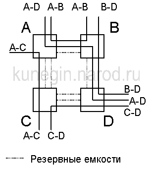Для сети с произвольной структурой, в узлах которой установлена АОП, в случаях возникновения на сети отказов, разрывающих имеющиеся тракты, возможно переключение потоков с использованием резервов пропускной способности работоспособных линий (реконфигурация). На Рис. 6.48 показан пример фрагмента сети и схема прохождения трактов на нем при нормальном режиме работы. На Рис. 6.49 - тот же фрагмент после реконфигурации, вызванной отказом линии между узлами А и В.