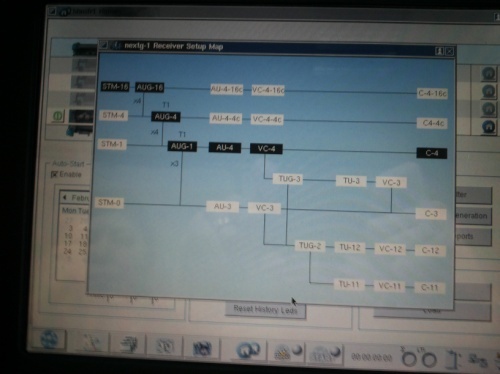 В этих окнах отображается схема мультиплексирования для SDH/ SONET/PDH/T-канала, чтобы Вы могли увидеть маршрут размещения в графическом виде. Здесь также показан номер конкретного тестируемого компонентного потока. Внешний вид окна настройки схемы размещения для передатчика и приемника показан на рисунке 4.