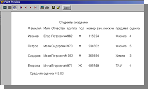 Для осуществления печати результатов, представления данных в удобной для просмотра форме удобно использовать так называемые отчёты. В Borland C++ Builder имеется набор компонент для быстрой визуальной разработки отчётов. За автоматическую генерацию отчёта отвечает компонента QuickReport. Для создания отчёта необходимо выполнить последовательность действий: 1. Создать дополнительную форму для отчёта, выбрав опции меню File-> New Form. При созданииновой формы автоматически будет сгенерировано три новых файла с расширениями *.dfm, *.h, *.cpp. 2. В программные модули основной формы и формыотчётавключить директивой #include заголовочные файлы формы отчёта и основной формы соответственно (в модуле основной формы с именем Unitl.h необходимо вставить директиву #include " Unit2.h", где Unit2.h заголовочный файл формы отчёта). 3. Вынести на форму отчёта компоненту QuickReport из вкладки QReport. 4. Установить значение свойства DataSource компоненты QuickReport, указав имя соответствующей компоненты Data-Source. 5. Вынести на форму отчёта компоненты QRBand (полосы отчёта). Эта компонента является частью печатной страницы, т.е. основанием для ввода данных. В зависимости от свойств BandType различают несколько типов компоненты QRBand: заголовочная полоса (rbTitle) выводится только один раз в начале страницы (может содержать заголовок и наименования столбцов таблицы); полоса данных (rbDetail) содержит значения полей текущей записи и выводится столько раз, сколько записей в таблице; rbSummary выводится один раз в конце отчёта. 6. Установить значение свойства BandType компоненты QRBand. Рекомендуется выносить как минимум две полосы: заголовочную и данных. 7. На заголовочную полосу вынести компоненты QRLabel (аналогичны компонентам Label). Свойство Caption содержит выводимую на печать информацию (например, наименования столбцов, поясняющие надписи, расчётные значения и т.д.). 8. На полосу данных вынести компоненты QRDBText, отображающие значения определённых полей таблицы. Свойство DataSource устанавливает имя источника данных, а свойства DataField — имя выводимого поля. 9. Скорректировать размеры полос и взаимное расположение на них компонент. Предварительный просмотр на стадии проектирования приложения осуществляется двойным щелчком мыши на объекте QuickReport. Макет формы печати данных таблицы stud.dbf и рассчитанной средней оценкипредставлен на рис. 3.