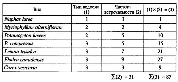 Оценка трофности водоема по высшим водным растениям основана на учете видового разнообразия растений и их индикаторной значимости. Для расчета общей трофности каждому типу водоема присваивается номер: ацидотрофные – 0, дистрофные – 1, олиготрофные – 2, мезотрофные – 3, эвтрофные – 4. Индикаторная значимость вида учитывается по таблице 3.