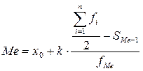 где n – число единиц совокупности. Затем рассчитывается накопленные частоты. После смотрят, какая из накопленных частот впервые превышает номер медианы. Медиану рассчитывают по формуле: