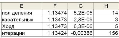 Sub Mpd () a = 1 b = 2 e = 0.0001 n = 0 Do x = (a + b) / 2 f1 = fnx(a) f2 = fnx(x) If f1 * f2 > 0 Then a = x Else b = x n = n + 1 Loop While Abs(b - a) > e x = (a + b) / 2 Worksheets(" Лист1").Range(" f2").Value = x Worksheets(" Лист1").Range(" g2").Value = fnx(x) Worksheets(" Лист1").Range(" h2").Value = n End Sub