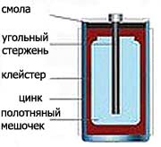 Например, гальванический элемент - в цинковый сосуд вставлен угольный стержень. Стержень помещен в полотняный мешочек, наполнен-ный смесью оксида марганца с углем. В элементе используют клейстер из муки на растворе нашатыря. При взаимодействии нашатыря с цинком, цинк приобретает отрицательный заряд, а угольный стержень - положительный заряд. Между заряженным стержнем и цинковым сосудом возникает электрическое поле. В таком источнике тока уголь является положительным электродом, а цинковый сосуд - отрицательным электродом. Из нескольких гальванических элементов можно составить батарею.