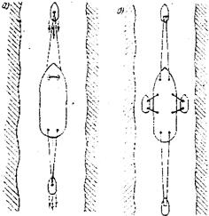 - уменьшение угрозы присасывания при обгонах судов и расхождении с ними; - сохранение откосов и стенок канала; - уменьшение угрозы обрыва швартовов судна, стоящих у причалов рек и каналов, и навала на них. Во всех случаях расхождения с судами, прохода узких мест и в других случаях, когда необходимо обеспечить лучшую управляемость, следует плавно снижать скорость судна. Резкое уменьшение скорости может привести к тому, что судно, поднятое на собственной кормовой волне, потеряет управляемость. Для обеспечения безопасности плавания крупнотоннажные суда в узкостях должны пользоваться помощью буксирных судов. Расстановка их в зависимости от тоннажа и осадки проводимого судна показана на рис. 23.4. а. б. В таких случаях с кормы и носа буксируемого судна подают не одинарные, а двойные буксиры (усы). Расходиться с судами и обгонять их следует, учитывая сказанное выше и местные правила. При отсутствии местных правил следует руководствоваться хорошей морской практикой.