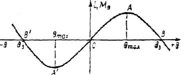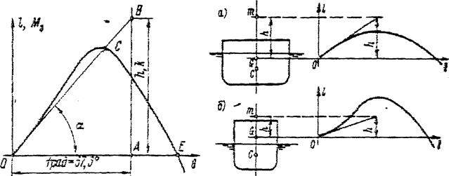Рисунок 2.23 наглядно показывает допустимые пределы использования метацентрической формулы (2.10), графиком которой является касательная OB. При малых Q прямая OB и кривая ОСЕ, выражающая действительный закон изменения плеча статической остойчивости по углу Q, практически совпадают. Резкое расхождение между ними начинается обычно после входа в воду кромки палубы» или выхода из воды скулы судна. При положительной начальной остойчивости характерными точками диаграммы являются точка О - положение устойчивого равновесия судна - и точки B и В' расположенные симметрично относительно начала координат и определяющие углы заката диаграммы Qз, при которых судно находится в положениях неустойчивого равновесия (ом. рис. 2.22). При углах крена, меньших угла заката, судне остойчиво, поскольку восстанавливающий момент стремится вернуть его в положение устойчивого равновесия О. Наибольшую по абсолютному значению ординату диаграммы, определяемую точками А или А' называют максимальным плечом диаграммы (или максимальным восстанавливающим моментом), а отвечающий этой ординате угол крена углом максимума диаграммы остойчивости. Наибольшая ордината диаграммы соответствует предельному статическому кренящему моменту, приложение которого еще не вызывает опрокидывания судна.