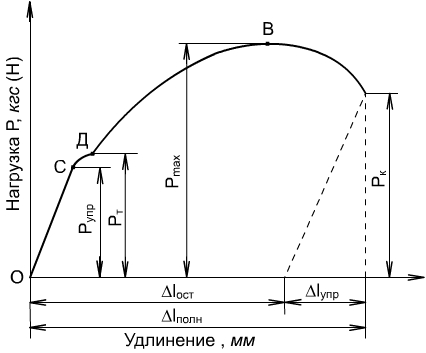 При помощи разрывной машины подвергают эти образцы растяжению медленно возрастающей нагрузкой вплоть до разрыва. Испытания выполняют на машинах механического или гидравлического действия. Машины снабжены устройством, позволяющим автоматически фиксировать на диаграмме растяжения величины приложенной нагрузки и изменение длины образца в увеличенном масштабе. Типичный вид такой диаграммы приведен на рис. 7.2.