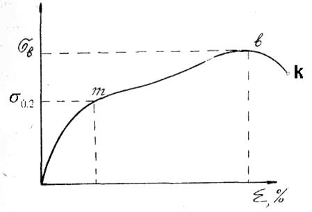 Рисунок 7.6. Диаграмма растяжения для средне- и высоко-углеродистой стали (без площадки текучести)
