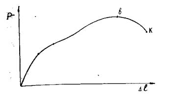 7.1. Измерить начальную длину ℓ 0 и начальный диаметр образца D0. 7.2. Привести испытание на растяжение и зафиксировать максимальную нагрузку Pb, выдержанную образцом без разрушения. Получить исходную машинную диаграмму растяжения образца в координатах Р-∆ ℓ 7.3. Измерить длину образца ℓ -∆ ℓ K после растяжения и диаметр образца в месте формирования шейки DK. 7.4. По диаграмме определить масштаб записи по оcи абсцисс –