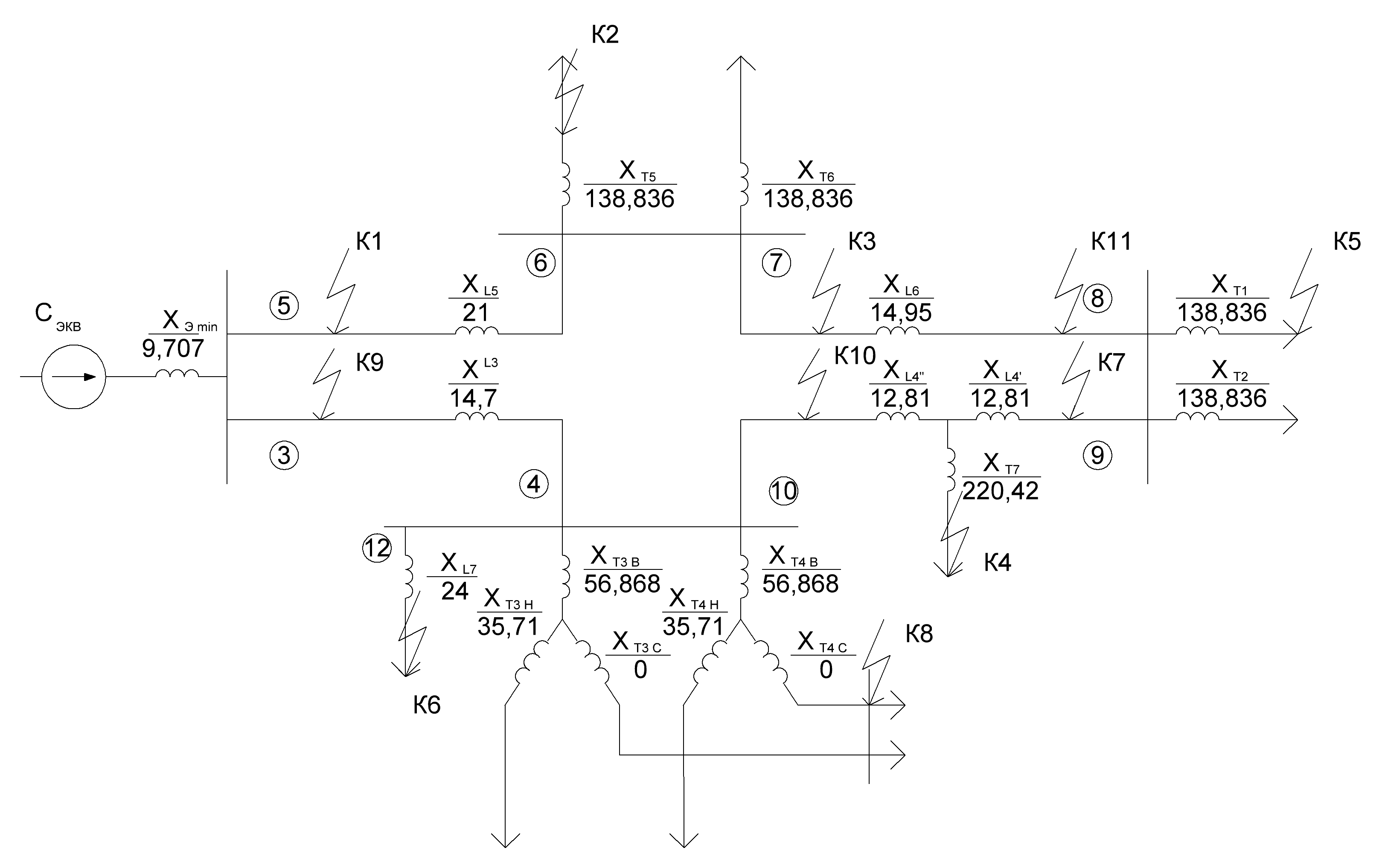 Вторая ступень дистанционных защит отстраивается, как правило, от КЗ в конце зоны действия первой ступени защиты следующей линии, за трансформатором, находящимся в конце линии и от защит, установленных на тупиковых линиях. Для этого построим схему замещения и укажем все точки КЗ, от которых будем отстраивать данную ступень дистанционной защиты. Построим схему замещения для второй ступени.