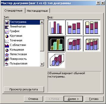 Графіки та діаграми використовуються для порівняння вихідних даних, та користуються ними при оформленні звітів та створенні презентацій. За даними таблиці побудуємо дві діаграма для порівняння вартості введених в дію нових основних засобів за 2005р., в яких буде відображено частку кожного району. Для створення діаграми ми використовуємо Майстер діаграм. Викликати Майстер Діаграм можна двома способами: · В головному меню вибираємо пункт Вставка → Діаграма. · На панелі інструментів вибираємо кнопку Майстер Діаграм Майстер діаграм має чотири кроки. Крок 1. Вибір типу та виду діаграми. Перше вікно діалогу Майстра діаграм, пропонує вибрати тип діаграми(Рис.1.6). Це вікно діалогу містить дві вкладки: одну для стандартних і іншу для нестандартних типів діаграм. Вибираємо об’ємний вид звичайної діаграми. Кнопка Далі.