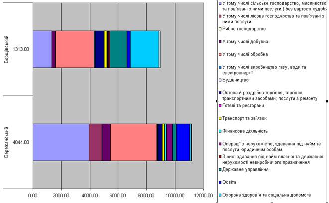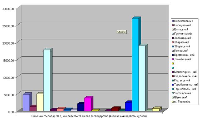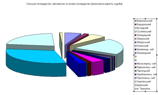 Рис.1.11 Вигляд об’ємної розрізаної кругової діаграми. Створюємо об’ємну лінійну діаграму з накопиченням, діапазоном даних для цієї діаграми буде A1: D20. Таким чином у ній відобразиться внесок кожного із засобів в загальну суму по двох районах Бережанському і Борщівському.