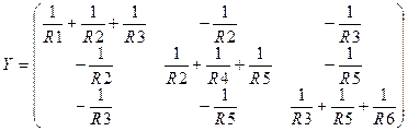 б) вектор узловых токов: в) вектор потенциалов узлов: 2) построение программы моделирования для SciLab: // ВВОД ИСХОДНЫХ ДАННЫХ //Инициализация переменных E1=10; E2 = 15; R1=10; R2=1E3; R3 = 2E3; R4=1.5E3; R5=2E3; R6 = 10; I1=E1/R1; I2=E2/R6; // ВВОД МОДЕЛИ // матрица узловых проводимостей y11 = 1/R1 + 1/R2 + 1/R3; y12 = -1/R2; y13 = -1/R3; y21 = - 1/R2; y22 = 1/R2 + 1/R4 + 1/R5; y23 = -1/R5; y31 = - 1/R3; y32 = -1/R5; y33 = 1/R3 + 1/R5 + 1/R6; Y = [y11 y12 y13; y21 y22 y23; y31 y32 y33]; // вектор узловых источников тока I = [I1; 0; I2]; // МОДЕЛИРОВАНИЕ // решение СЛАУ формальным методом F=inv(Y)*I; // вывод результата F // проверка Y*F-I // решение СЛАУ с помощью функции linsolve F=linsolve(Y, -I); // вывод результата F // проверка Y*F-I // РАСЧЕТ ТОКОВ ВЕТВЕЙ // Расчет разностей потенциалов ветвей в соответствии с // произвольно выбранным направлением токов u(1)=F(1); u(2)=F(1)- F(2); u(3)=F(1)- F(3); u(4)= F(2); u(5)=F(2)- F(3); u(6)= F(3); // ввод проводимостей ветвей g(1) = 1/R1; g(2) = 1/R2; g(3) = 1/R3; g(4) = 1/R4; g(5) = 1/R5; g(6) = 1/R6; // расчет токов ветвей For j=1: 6; i(j)=u(j)*g(j); end; // Вывод значений токов i // если значение тока отрицательное, то его направление // противоположно назначенному на этапе расчета разностей // потенциалов