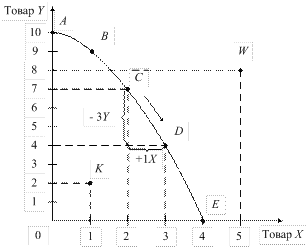 Согласно альтернативе А все ресурсы используются для производства товара Y (10 штук), а товар X не производится. Если требуется произвести товар X, то, вследствие нехватки ресурсов, необходимо их определённое количество изъять из производства товара Y и переориентировать на производство товара X. Так, например, в производственной альтернативе D количество товара X равно 3 ед., однако при этом объёме производства ресурсов хватает только для производства 4 ед. товара Y. Следовательно, при переходе от производственной альтернативы A к D, для наращивания производства товара X c 0 до 3 ед., необходимо отказаться от выпуска Если по горизонтальной оси отложить количество товара X, а по вертикальной оси – количество товара Y, то кривая ABCDE определит производственные возможности (границы) общества (рисунок 2.1). Кривая производственных возможностей (ABCDE) – это линия, каждая точка которой показывает максимально возможный объём производства двух товаров при использовании всех имеющихся в обществе ресурсов. Точка K находится внутри кривой производственных возможностей (КПВ) и показывает объём производства, при котором ресурсы используются не в полном объёме, либо неэффективно, то есть в обществе существует неполная занятость и незадействованные производственные мощности. Точка W (за пределами КПВ) иллюстрирует объёмы производства товаров X и Y, которые недостижимы в связи с ограниченностью ресурсов в экономике (рисунок 2.1).