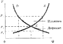 Только в точке Е цена устраивает одновременно и покупателя и продавца. Действительно, производителям невыгодно дальнейшее повышение цены и увеличение предложения, так как товар или услуга не найдут спроса. Кто нарушит это правило — обанкротится. Потребитель также должен рассчитывать на снижение цен, но это противоречит интересам производителей. Если рыночная цена ниже равновесной (P1, то возникает дефицит, при котором величина спроса превышает величину предложения. Когда же рыночная цена выше цены равновесия (Р2), образуется избыток товаров, при которомобъем предложения превышает объем спроса. Таким образом, равновесная цена — это цена, при которой количество товара, предложенного на рынке, равно количеству товара, на который предъявлен спрос. Иначе говоря, равновесная цена — это цена, при которой величина спроса со стороны покупателей совпадает с величиной предложения со стороны продавцов. Если цена поднимется выше точки равновесия, она будет стимулировать наращивание производства, образуется избыток товара. Между производителями данного вида товара начнется конкуренция, в результате которой цена на него начнет снижаться, приближаясь к точке равновесия. Если же цена установится ниже равновесной, она обострит конкуренцию между покупателями. Это приведет к повышению цены, расширению производства и возвращению цены к ее равновесному значению. Так происходит колебание спроса и предложения вокруг цены равновесия и благодаря конкуренции устанавливается рыночное равновесие. Различают стабильное (устойчивое) и нестабильное (неустойчивое) рыночное равновесие. Стабильное имеет место тогда, когда нарушенное равновесное состояние восстанавливается вновь; нестабильное — когда нарушенное равновесие рынка остается таковым на протяжении длительного периода времени.