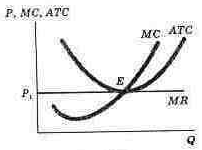Рис. Равновесие конкурентной фирмы в долгосрочном периоде На графике видно, что в точке Е соблюдаются все три условия долгосрочного равновесия. Если цена превысит минимальные средние общие издержки, фирмы в отрасли будут получать экономическую прибыль, что привлечет на рынок конкурентов. В результате предложение повысится, а цена понизится до уровня равновесной. И наоборот, при падении цены ниже равновесной, фирмы будут получать прибыль меньше нормальной, что вызовет их отток из отрасли. Предложение понизится, а цена возрастет до уровня равновесной. Следовательно, можно сделать вывод, что в условиях совершенной конкуренции экономическая прибыль является временным явлением. Экономисты считают рынки с совершенной конкуренцией высокоэффективными, так как, во-первых, здесь достигается производственная эффективность при цене, равной минимальным средним общим издержкам, что означает изготовление товара наименее дорогостоящим способом (лучшая технология, минимум ресурсов, низкие цены); во-вторых, имеет место эффективное распределение ресурсов, т.е. создание необходимых потребителям товаров при Р = МС; а в-третьих, вследствие свободного перелива ресурсов конкурентные рынки обладают способностью быстро восстанавливать эффективность использования ресурсов при возможных нарушениях равновесия. В то же время существуют некоторые ограничения эффективности совершенной конкуренции: 1) не решаются проблемы распределения доходов, общественных благ, отрицательных внешних эффектов; 2) не всегда используется наиболее эффективная техника, так как нововведения быстро дублируются конкурентами, а небольшой размер конкурентной фирмы ограничивает возможности автоматизации и финансирования; 3) стандартизированный товар ограничивает диапазон потребительского выбора.