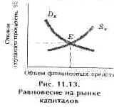 Доход, получаемый на ссуду Ставка % = ——————————————— х 100%. Ссуда Процентная ставка является ценой ссудного капитала, т.е. определяет количество денег, которое необходимо заплатить за каждый занятый рубль. Ставка ссудного процента в конечном счете формирует спрос и предложение на рынке ссудного капитала. При прочих равных условиях спрос на ссудный капитал будет тем больше, чем ниже процентная ставка. И наоборот, предложение будет тем больше, чем выше ставка процента. Точка пересечения кривых спроса на ссудный капитал и его предложения определяет равновесную ставку ссудного процента, при которой объем предполагаемых заемных средств равен их количеству (рис. 11.13). В точке Е, где спрос равен предложению, происходит совпадение предельной доходности капитала и предельных издержек утраченных возможностей.