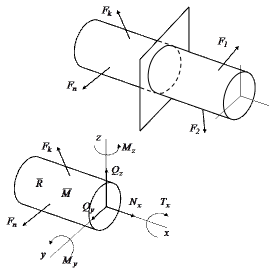 1) умовно робимо переріз у місці визначення внутрішніх сил; 2) відкидаємо одну з двох частин перерізаної деталі; 3) дію відкинутої частини на залишену замінюємо внутрішніми силами. Ці сили зрівноважуються зовнішніми силами, що прикладені до залишеної частини; 4) визначаємо невідомі внутрішні сили з рівнянь рівноваги. У загальному випадку просторової задачі система внутрішніх сил (рисунок 1.1 б) зводиться до головного вектора сил