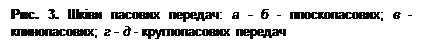 Приводні паси пасових передач повинні мати: достатню міцність при змінній напрузі і стійкість проти спрацювання; достатній коефіцієнт тертя паса із шківом; низьку згинальну жорсткість; високу довговічність; низьку вартість. Приводні паси стандартизовані. Плоскі паси: гумотканинні, бавовняні суцільноткані, шкіряні, із спеціальних синтетичних матеріалів. Клинові паси виготовляють двох типів: кордтканинні та корд шнурові Круглі паси виготовляють шкіряними, гумотканинними, бавовняними, капроновими. Діаметр шківів 3...4 (12) мм. Шківи пасових передач мають обід 1, який несе пас, маточину 3, за допомогою якої шків розміщується на валі, та диск 2 або спиці, що з’єднують обід із маточиною (рис. 3, а). Форма робочої поверхні ободу 1 шківа визначається формою поперечного перерізу паса. Для плоских пасів згідно ГОСТ 17383-80 робоча поверхня одного шківа плоска, а другого паса - випукла (б), що забезпечує центрування паса.