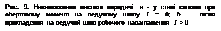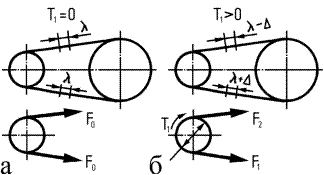 Силові залежності пасових передач Вітки паса у стані спокою при обертовому моменті на ведучому шківу Т = 0 навантажені лише зусиллям попереднього натягу F0 (рис. 9, а). Після прикладення на ведучий шків робочого навантаження момент T > 0 у ведучій вітці виникає зусилля F1, а у веденій – зусилля F2 (рис. 9, б)