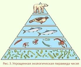Трофическую структуру экосистемы можно изобразить графически в виде экологической пирамиды, в основании которой лежит первый уровень. Эти пирамиды отражают законы расходования биомассы и энергии в пищевых цепях. Численное значение каждой ступени такой пирамиды может быть выражено числом особей, их биомассой или накопленной в ней энергией. Пищевые сети, возникающие в экосистеме, имеют структуру, для которой характерно определенное число организмов на каждом трофическом уровне. Замечено, что число организмов прямо пропорционально уменьшается при переходе с одного трофического уровня на другой. Такая закономерность получила название «правило экологической пирамиды». В данном случае рассмотрена пирамида чисел. Она может нарушаться, если мелкие хищники живут благодаря групповой охоте на крупных животных.