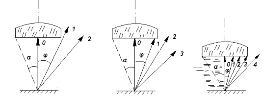 Рис. 2.3. Схема действия апертуры объектива: 0, 1, 2, 3 – направления дифрагированных деталями структуры максимумов; а – детали структуры, слишком мелкие и не разрешают- ся объективом (ϕ < α); б – детали ϕ > α); в – действие масляной иммерсии (сравните б и в, в последнем случае пропускаются максимумы высших порядков)