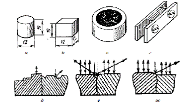 Рис. 3.1. Нормальные размеры металлографических образцов (а и б) и приспособления для монтирования образцов малого размера (в и г). Схема образования контраста в изображении структур: д – формирование контраста; е – граница зерен; ж – избирательное растравливание одной из фаз