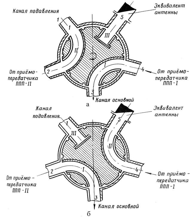 рисунок 2.7. Переключатель передатчиков Схематическое изображение переключателя передатчиков в зависимости от выбранного режима использования ППД2 представлено на рисунке 2.8. Как видно из рисунка 2.7а, входы волноводов подвижной части I и II подсоединяются к передатчикам секторного обзора и подавления. К волноводному отрезку III подсоединен эквивалент антенны. Выходы волноводов I и II подсоединяются к основной антенне и антенне подавления. При работе передатчиков секторного обзора и подавления СВЧ энергия от этих передатчиков по волноводам I и II проходит к антеннам секторного обзора и антеннам подавления (положение (а)). При выходе из строя передатчика секторного обзора вращающаяся часть переключателя передатчиков поворачивается таким образом, что энергия от передатчика подавления по волноводу I (положение (б)) проходит к антеннам курса и глиссады (основной канал). Передатчик секторного обзора через волновод II подсоединяется к эквиваленту антенны. антенны подавления в этом случае не используются. Изменение положения волноводов I и II переключателя передатчиков осуществляется при снятом высоком напряжении с анодов магнетронов.