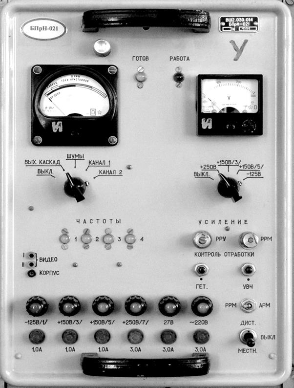 рисунок 4.19. БПрН-021 стороны лицевой панели) размещены: усилитель высокой частоты, гетеродин, УПЧ, плата видеоусилителя и переключатель частот. Справа размещены линейки выпрямителей и стабилизаторов, а также панель с реле. На лицевой панели сверху установлены сигнальные лампы ГОТОВ и РАБОТА, ниже установлены контрольно-измерительные приборы, переключатели рода измерений. Под переключателями расположены сигнальные лампы выбранной частоты, контрольные гнезда ВИДЕО 1, ВИДЕО 2, КОРПУС, потенциометры регулировок мощности и усиления, кнопки контроля отработки механизмов перестройки гетеродина и УВЧ. На нижней части панели расположены предохранители и соответствующие им лампы контроля исправности. В правом нижнем углу расположены переключатели выбора режимов РРМ-АРМ, МЕСТН.-ДИСТАНЦ. Высокочастотный разъем ВЫХОД расположен на задней части рамы. Там же расположен разъем питания и низкочастотных сигналов. Схема коммутации блока БПрН-021 дает возможность осуществить: сигнализацию наличия напряжения накала и –125 В (по наличию сигнала «Готов»); местное и дистанционное включение с помощью переключателя В2 МЕСТН.-ДИСТАНЦ.; местное переключение фиксированных частот с помощью переключателя В2 ЧАСТОТА, при этом на лицевой панели блока загорается лампа выбранной частоты настройки; сигнализацию работоспособности блока БПрН-021 и отработку механизмов перестройки гетеродина и УВЧ (сигнал " Работа"); сигнализацию местного включения (сигнал " +27В").