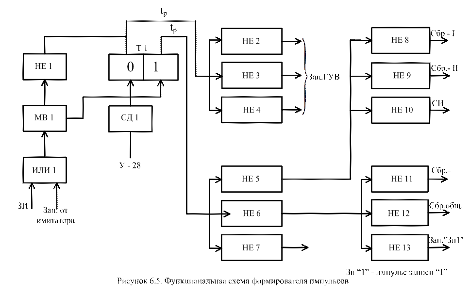 Плата ЛОУ включает следующие устройства: формирователь импульсов, синхронизатор, электронный коммутатор, узел входной обработки видеосигналов, сдвигатели информации, анализатор информации. Формирователь импульсов Формирователь импульсов вырабатывает сигнал прямоугольной формы длительностью tр (определяет величину рабочей дальности БОП) (рисунок 6.5). Эти сигналы используются для запуска ГУВ, плат А1, А2. Основу формирователя составляет триггер Т1. В качестве импульсов запуска могут использоваться как ЗИ из блока БСФ, так и от имитатора импульсов на входе ИЛИ1. Импульс мультивибратора МВ1 переводит триггер Т1 в одно из устойчивых состояний. Окончание импульсов tр определяется моментом прихода адресного импульса У28 с электронного коммутатора ЛОУ, предварительно пропущенного через селектор длительности СД1. Этот импульс переводит Т1 в исходное состояние. Трансляция сигналов к потребителям обеспечивается через набор схем НЕ. Функциональная схема синхронизатора Синхронизатор формирует ряд импульсов: Сдв.-1, Сдв.-2 – для записи и считывания информации из ЗУ; СО – стробы обращения к ЗУ; СИ - стробы информации и записи ЗУ. Функциональная схема синхронизатора приведена на рисунке 6.6. Запуск синхронизатора ведется ТИ от ГУВ. Тактовые импульсы запускают три отдельных канала формирования с выхода ИЛИ2 в течение временного интервала t Р.