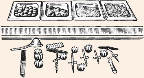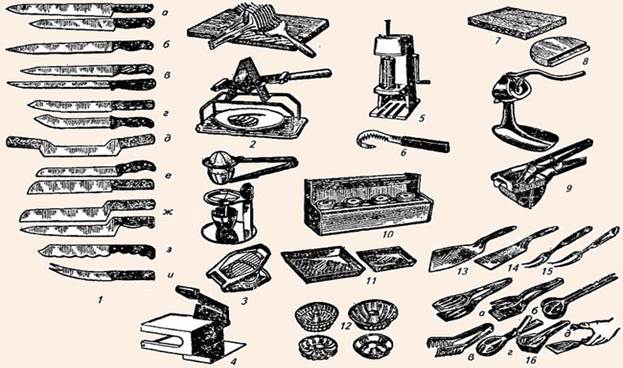 Инвентарь и приспособления, используемые в холодном цехе: 1 - ножи гастрономические: а - филейные; б - гастрономический (колбасный); в - для нарезки ветчины; г - кухонные; д - с двумя ручками для нарезки сыра и масла; е, ж - с одной ручкой для нарезки сыра и масла; з - для фигурной нарезки масла; и - нож-вилка; 2 - томаторезки ручные; 3 - яйцерезки; 4 - приспособление для нарезки сыра; 5 - ручной делитель масла; 6 - скребок для сливочного масла; 7 - доска разделочная; 8 - доска для нарезки лимонов; 9 - соковыжималки ручные; 10 - горка для гарниров; 11 - лотки для заливных блюд; 12 - формы для паштетов, заливных и сладких блюд; 13 - лопатка-нож для раскладывания заливных блюд; 14 - лопатка для раскладывания порционных блюд; 15 - вилки производственные для раскладывания блюд; 16 - приборы для раскладывания блюд: а, б, в - приборы салатные; г - прибор для консервированных фруктов; д - щипцы для раскладывания порционных блюд. На рабочем месте для приготовления салатов и винегретов используют ванны или стол со встроенной моечной ванной для промывки свежих овощей, зелени. Нарезают сырые и вареные овощи на разных разделочных досках с маркировкой «ОС» или «ОВ», применяя ножи поварской тройки. Для механизации нарезки овощей устанавливают универсальный привод ПХ-0, 6 со сменными механизмами. Рациональная организация рабочего места состоит из двух производственных столов: на одном столе нарезают овощи, смешивают компоненты и заправляют салаты и винегреты (это может быть стол секционный модулированный для малой механизации СММСМ или обычный производственный стол), на другом столе порционируют и оформляют салаты и винегреты перед отпуском в торговый зал, для этой операции применяют секционные модулированные столы с охлаждаемым шкафом и горкой СОЭСМ-2 или СОЭСМ-3. На столе стоят настольные весы ВНЦ-2, справа ставят посуду с готовым салатом и мерный инвентарь для ее порционирования (ложки, лопатки, салатные приборы), слева - столовую посуду (салатники, закусочные тарелки). Здесь же производят оформление блюд. Перед оформлением салатов подготавливают продукты, используемые в качестве украшений (делают украшения из овощей, нарезают отварные яйца, помидоры, зелень петрушки, карбонат, лимоны и т. д.). Нарезка производится специальными инструментами и приспособлениями. Подготовленные продукты хранят в секциях охлаждаемой горки Из сладких блюд в холодном цехе готовят компоты, кисели, желе, муссы, самбуки и др. На рабочем месте повара для приготовления сладких блюд устанавливают ванну, производственный стол с охлаждаемым шкафом, настольные весы ВНЦ-2 и используют различный инвентарь, инструменты, формочки, столовую посуду (рис. 24). Для выполнения многих операций применяют универсальный привод со сменными механизмами для протирания фруктов, ягод, взбивания сливок, муссов, самбуков.