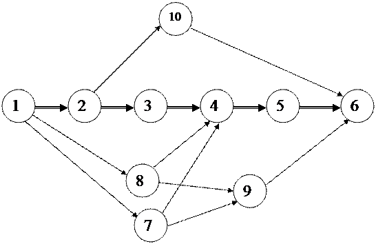 Рис.2.1. Пример графа многовариантного операционного маршрута Граф, изображенный на рис.2.1, может отображать, к примеру, следующее: -различные концентрации технологических операций: операция, соответствующая вершине 8, включает в себя переходы операций, соответствующих вершинам 2 и 3; операция, соответствующая вершине 7 включает операции 2 и 3 вершин; операция, соответствующая вершине 10 включает операции 3, 4, 5 вершин); -использование альтернативных операций например, за счет применения технологического оборудования с различной степенью автоматизации либо различных методов обработки (например, сверление или электроэрозионная обработка): на графе это операции, соответствующие вершинам 7 и 8; Основной целью системного анализа технологического процесса на операционном уровне является выбор оптимального маршрута: такого пути на многовариантном графе, который является наилучшим по выбранным заранее критериям. Рассмотрим подробнее процесс выбора оптимального пути (варианта технологического процесса). Основными критериями оптимизации могут быть: приведенные затраты на операцию, штучное (штучно-калькуляционное) время и др. В качестве дополнительных критериев оптимизации могут служить площадь, занимаемая оборудованием, энергоемкость и др. Существует ряд методов решения многокритериальных оптимизационных задач, наиболее используемыми являются: - построение обобщенного критерия оптимизации; - пороговая оптимизация. Оптимизация по обобщенному критерию