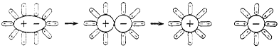 Органические кислоты и основания обычно являются слабыми электролитами. Неэлектролит вообще не диссоциирует на ионы и поэтому не обладает способностью проводить электрический ток. Большинство органических соединений принадлежат к неэлектролитам. Механизм электролитической диссоциации — распада молекул или кристаллов растворяемого вещества на ионы под влиянием молекул растворителя — был понят несколько позднее. Согласно современным воззрениям, такой распад является результатом взаимодействия полярных молекул растворителя, например воды, с молекулами или кристаллической решеткой растворяемого вещества. Молекулы растворителя атакуют кристаллическую решетку, разрушая ее и переводя составные части решетки (ионы) в раствор в форме сольватированных (гидратированных) заряженных частиц Окружающие эти ионы полярные молекулы растворителя ориентированы в соответствии с зарядом ионов. Растворение электролита в известной мере упорядочивает молекулы растворителя. Естественно предположить, что эта способность к упорядочению молекул растворителя у многозарядных ионов выражена сильнее, чем у однозарядных. В этом и нужно искать причину того, что соли, содержащие многозарядные ионы, плохо растворимы (в ряде случаев практически нерастворимы) в воде. Например, хлорид бария растворим хорошо, а сульфат бария — очень плохо. Следовательно, влияние растворенного вещества и растворителя является обоюдным: полярные молекулы растворителя разрушают кристаллическую решетку растворяемого вещества на отдельные ионы, а эти ионы, переходя в раствор, вызывают изменение растворителя, заставляя его молекулы упорядочиваться. Кроме того, сольватированные ионы растворенного вещества не индифферентны по отношению друг к другу. Противоположно заряженные ионы имеют тенденцию притягиваться силами электростатического взаимодействия, образуя нейтральные молекулы или нейтральные группы молекул. Разумеется, в реальном растворе всегда присутствуют как отдельные сольватированные ионы, так и нейтральные молекулы.