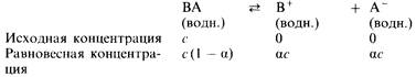 что является математическим выражением закона разведения Оствальда: степень диссоциации слабого электролита в растворе тем выше, чем более разбавлен раствор. Допустим, что при растворении электролита ВА в воде образуется раствор, имеющий концентрацию с. В результате некоторая часть а электролита ВА диссоциирует, образуя ионы B+ и А–. Величина a называется степенью диссоциации. Равновесная концентрация неионизированного электролита ВА оказывается равной с(1– a). Таким образом, можно записать