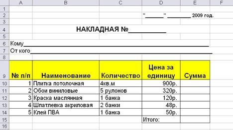 Для остального текста: шрифт Times New Roman, размер 12, начертание Обычное. □ Обрамление трёх последних строк. Задание 3: Создать в программе MS Excel: накладную (См. образец). Заполни её своими данными. Рассчитай данные по столбцу «Сумма» и полю «Итого». Распечатать таблицу в двух видах: с формулами и итоговыми расчетами.