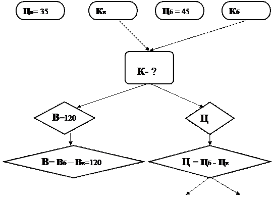До якої з даних задач побудована логічна схема рішення? Обведіть відповідну букву (А, Б, В). Вставте в схему відповідні знаки арифметичних дій і пронумеруйте їх. Запишіть рішення у вигляді числового виразу. А. Для школи закупили однакову кількість волейбольних і баскетбольних м’ячів. За всі волейбольні м’ячи заплатили 420 грн., а за всі баскетбольні – 540 грн. Яка ціна баскетбольного м’яча, якщо один волейбольний м’яч коштує 35 грн.? Б. На 960 грн. школа закупила однакову кількість волейбольних і баскетбольних м’ячів. На скільки вартість волейбольних м’ячів менша за вартості баскетбольних, якщо ціна волейбольного м’яча складає 35 грн., а баскетбольного – 45 грн.? В. Для школи закупили однакову кількість волейбольних і баскетбольних м’ячів, причому всі волейбольні м’ячі коштують на 120 грн. менше ніж усі баскетбольні. Скільки заплатили окремо за волейбольні і баскетбольні м’ячі, якщо ціна волейбольного м’яча становить 35 грн., а баскетбольного 45 грн.?
