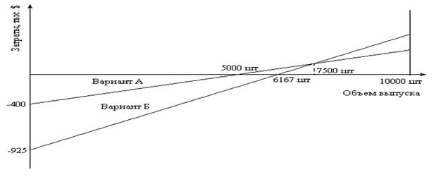 Вариант Б обеспечивает более высокую прибыль. Однако при первом варианте технологии порог рентабельности более низкий, а это значит, что при росте спроса прибыль будет получена быстрее. Кроме того, при малых объемах спроса вариант А дает более высокую прибыль или меньшие убытки. Если вариант А более доходный при малых объемах реализации, а вариант Б – при больших объемах, то должна быть какая-то точка пересечения, в которой оба варианта имеют одинаковую суммарную прибыль при одинаковом общем объеме реализации продукции. Для ее нахождения можно применять графический и аналитический методы. Построение графика зависимости прибыли от объема реализации по каждому варианту основывается на следующих данных: при нулевой реализации маржинальный доход равен 0, а компания несет убытки в размере постоянных затрат (вариант А $ 400 000., вариант Б - $ 925 000); при объеме реализации 10 000 единиц прибыль уже рассчитана (по варианту А – $ 400 000., по варианту Б '- $575 000). С помощью графика определяем порог рентабельности (безубыточный объем реализации продукции) и максимальную прибыль по каждому варианту. Из рис. 8.4 видно, что прибыль по обоим вариантам одинаковая при объеме реализации 7500 единиц, и при больших объемах вариант В становится более выгодным, чем вариант А.