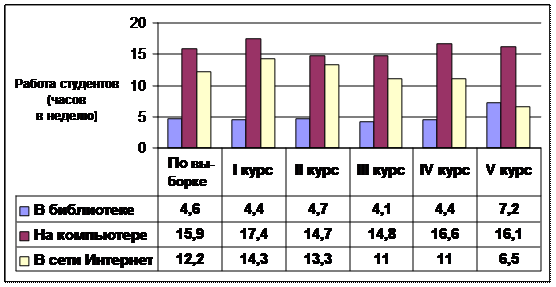 Рисунок 3 – Средние показатели посещаемости студентами библиотек, работы за компьютером и в сети Интернет