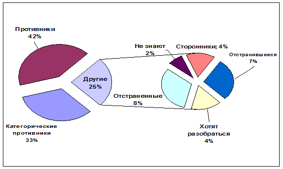 Рисунок 8 – Сегментация электората (с достройкой круговой диаграммы) В некоторых случаях достаточно наглядными являются так называемые диаграммы рассеяния, используемые для презентации результатов кластерного, факторного, регрессионного анализа. Как правило, при помощи них демонстрируются распределение случаев в моделируем пространстве (рис. 9), скопления случаев (кластеры, группы, рис. 10), проявления каких-либо тенденций, зависимостей (рис. 11).